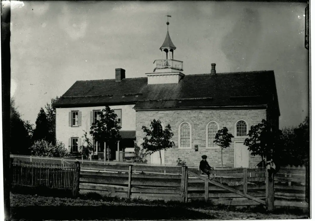 Photo Credit: “The 1793 Stone Church ” — The Old Schoeneck Church and parsonage, located in Schoeneck Village. A boy and a girl sit on the fence in the foreground. From the collection of the Moravian Historical Society. Image undated