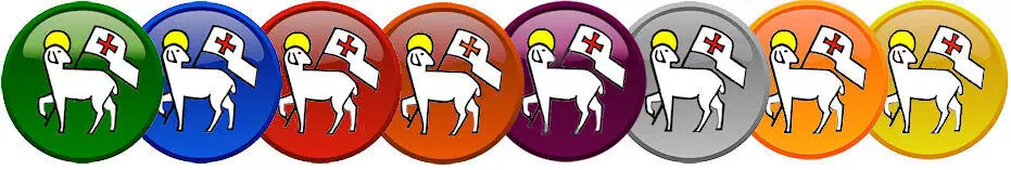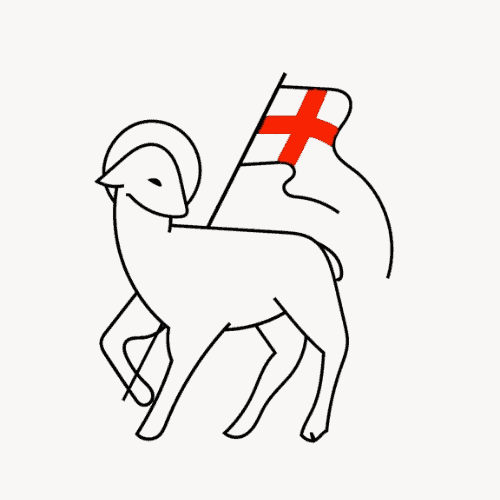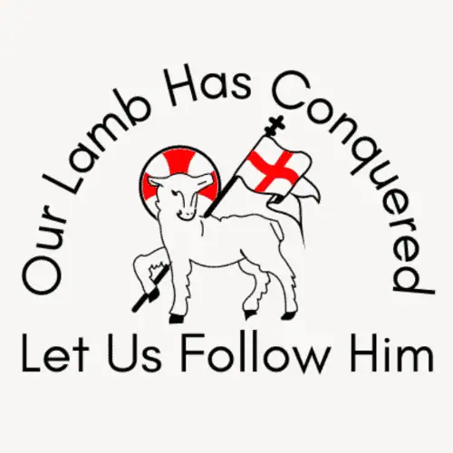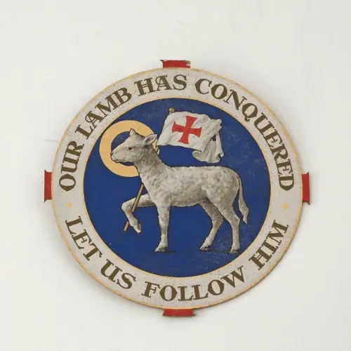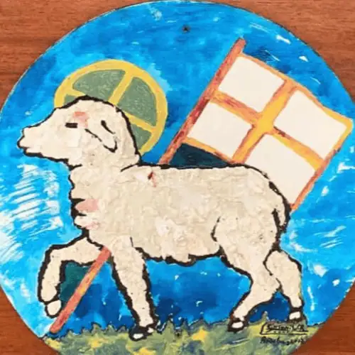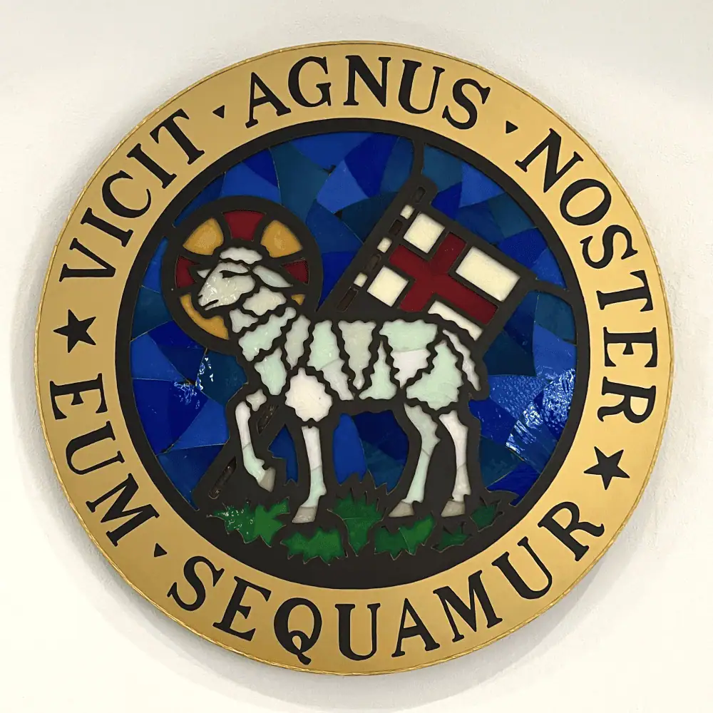 The Agnus Dei is used to refer to Jesus Christ in his role of the perfect sacrificial offering that atones for the sins of humanity, harkening back to ancient Jewish Temple sacrifices. The lamb of the Passover sacrifice is said to prefigure the crucifixion (Exodus 12:21-27). Isaiah calls the expected Messiah the Lamb of God (Isaiah 53:7), and Jesus is met by John the Baptist with the words, “Behold, the Lamb of God, who takes away the sins of the world” (John 1:29). The lamb with the banner represents Jesus Christ and his victory over sin and death.
