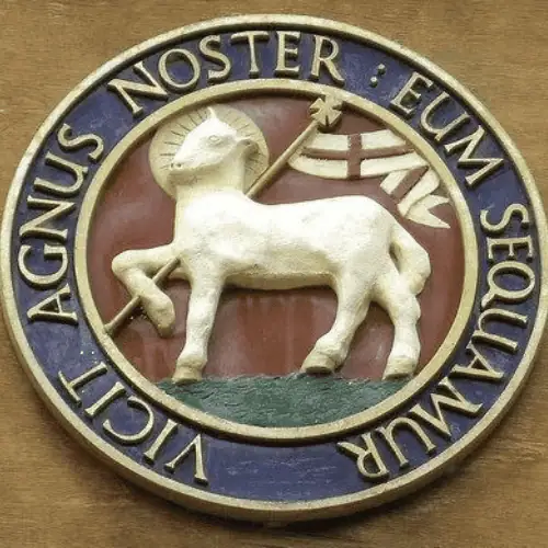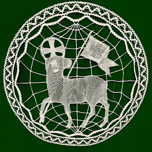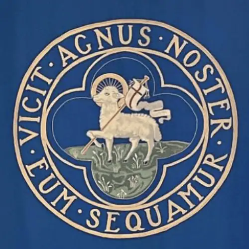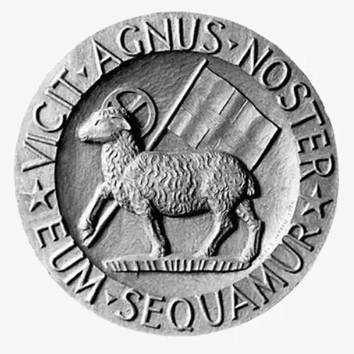 The Agnus Dei, a Latin term meaning Lamb of God, is one of the oldest Christian symbols. It was used as a symbol of the Christian church under Emperor Constantine as early as the fourth century. Several mosaics in early churches include it, some showing a row of twelve sheep representing the apostles flanking the central Agnus Dei.