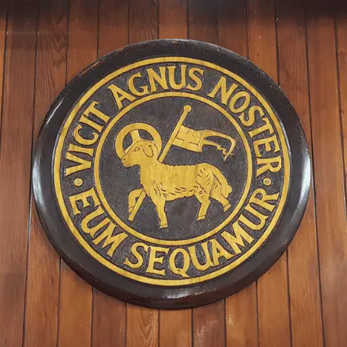 The Jablonski Seal features the official motto of the Moravian Church. Written in a circular band around the Agnus Dei are the words: Vicit Agnus Noster, Eum Sequamur in Latin, which translates to Our Lamb Has Conquered, Let Us Follow Him in English. This is the Official Motto of the Moravian Church, and expresses the Moravian conviction that Christ the Lamb of God is at the center of our faith.