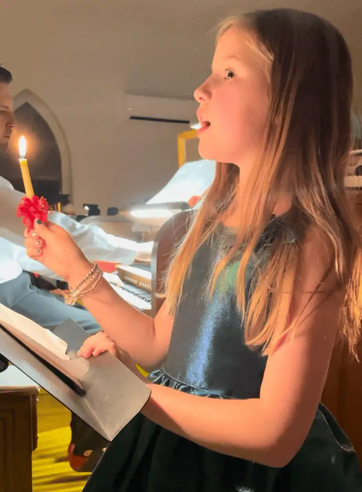 Morning Star is a beloved hymn sung by Moravians on Christmas Eve during our candlelight vigils. A young child sings the beginning of the hymn and then the congregation sings back, with the child and the congregation singing back and forth. Soloists are usually between the ages of 7 to 12 years old and practice for several weeks leading up to Christmas Eve. More than one child may sing each year, as our church has several Christmas Eve services.